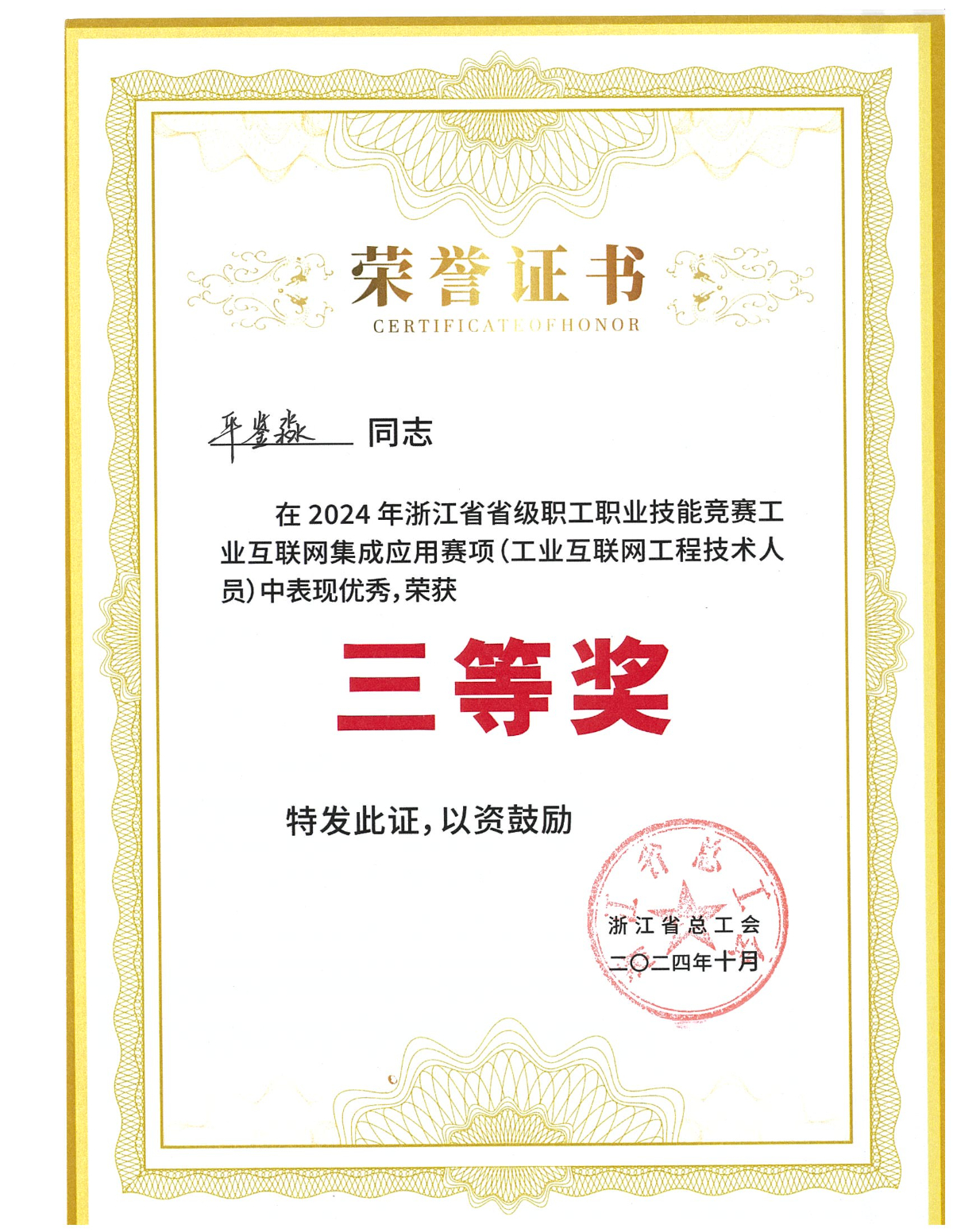 10月25日,2024年浙江省省级职工职业技能竞赛工业互联网集成应用赛场也传来好消息,由浙能数科员工组成的省部属企事业工会代表队表现优异,平鉴淼以第六名的成绩荣获个人三等奖。