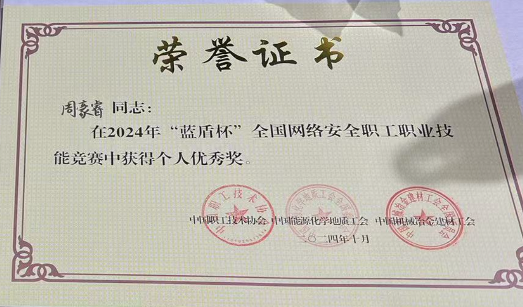 10月24日,2024“蓝盾杯”全国网络安全职工职业技能竞赛在山东青岛圆满闭幕。来自浙能数科的3名参赛选手,经过长达8小时的激烈角逐荣获团体三等奖,运营安全中心周豪睿获个人优秀奖。